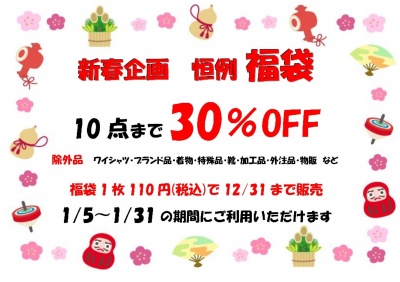 新春企画 12月31日迄販売する福袋を1枚110円(税込み)で購入いただきますと、 2026年1月5日〜1月31日迄の期間 10点までクリーニング代が30%OFF(除外品あり) お得な福袋の販売は数量限定です 是非、ご来店お待ちしております。